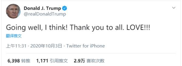 特朗普入院治疗后再发推:一切都好,谢谢所有人
