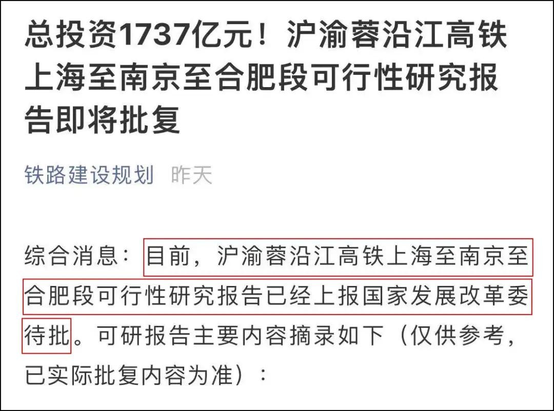 最新消息,沪渝蓉沿江高铁上海至南京至合肥段(即北沿江高铁),可行性研究报告已经上报国家发展改革委待批。