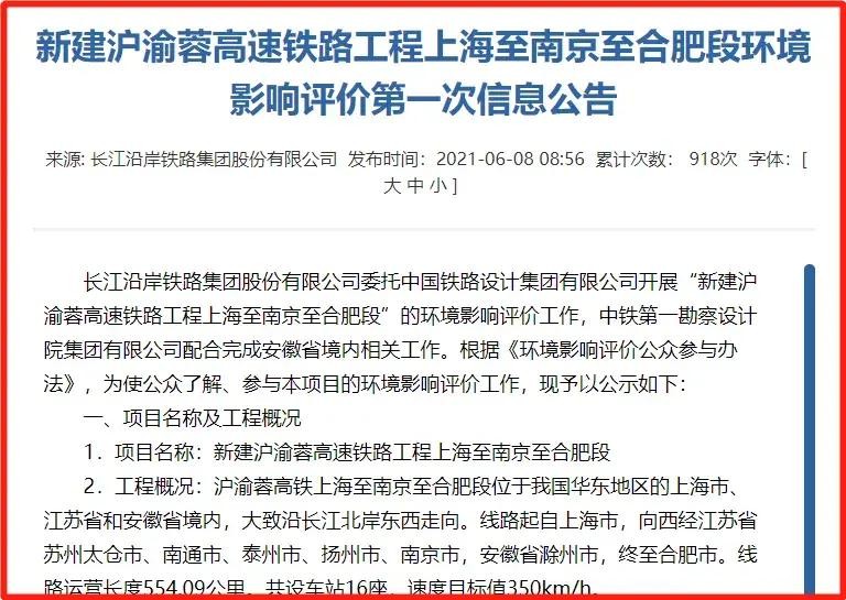 南通市交通运输局政府网站公布:北沿江高铁上海至南京至合肥段环评第一次公示。