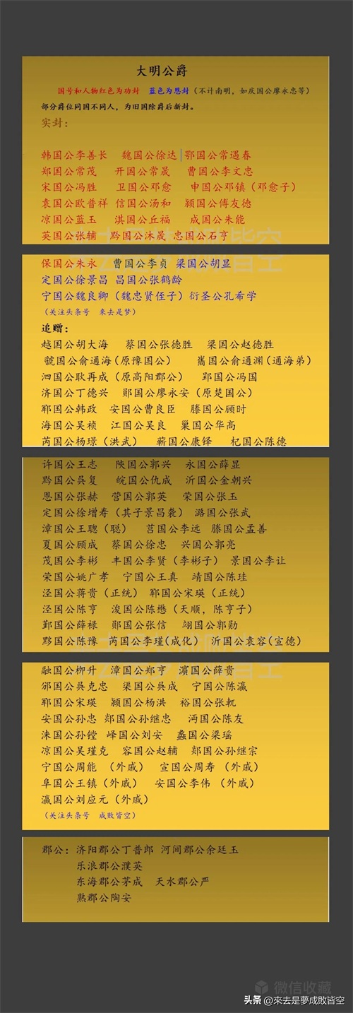 这些国公一字封号对标宗室亲王,但实授公爵的数量远比明朝亲王少的多,根据《明史》、《弇山堂别集》、《万历野获编》、《明实录》等内容,粗劣的做了个统计,明朝公爵国号和获封赠着如下: