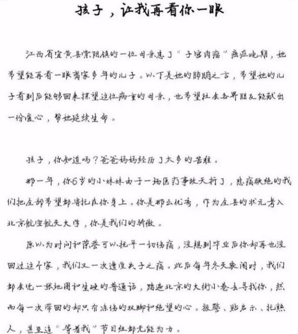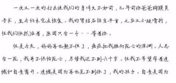 “今天,妈妈再也熬不住了,癌症把我推向死亡的深渊。人总有一死,我并不惧怕死亡,尽管我还不到六十岁。但我不希望带着遗憾和自责离开。回来吧!孩子,让我再看你一眼,妈妈的时间不多了。”