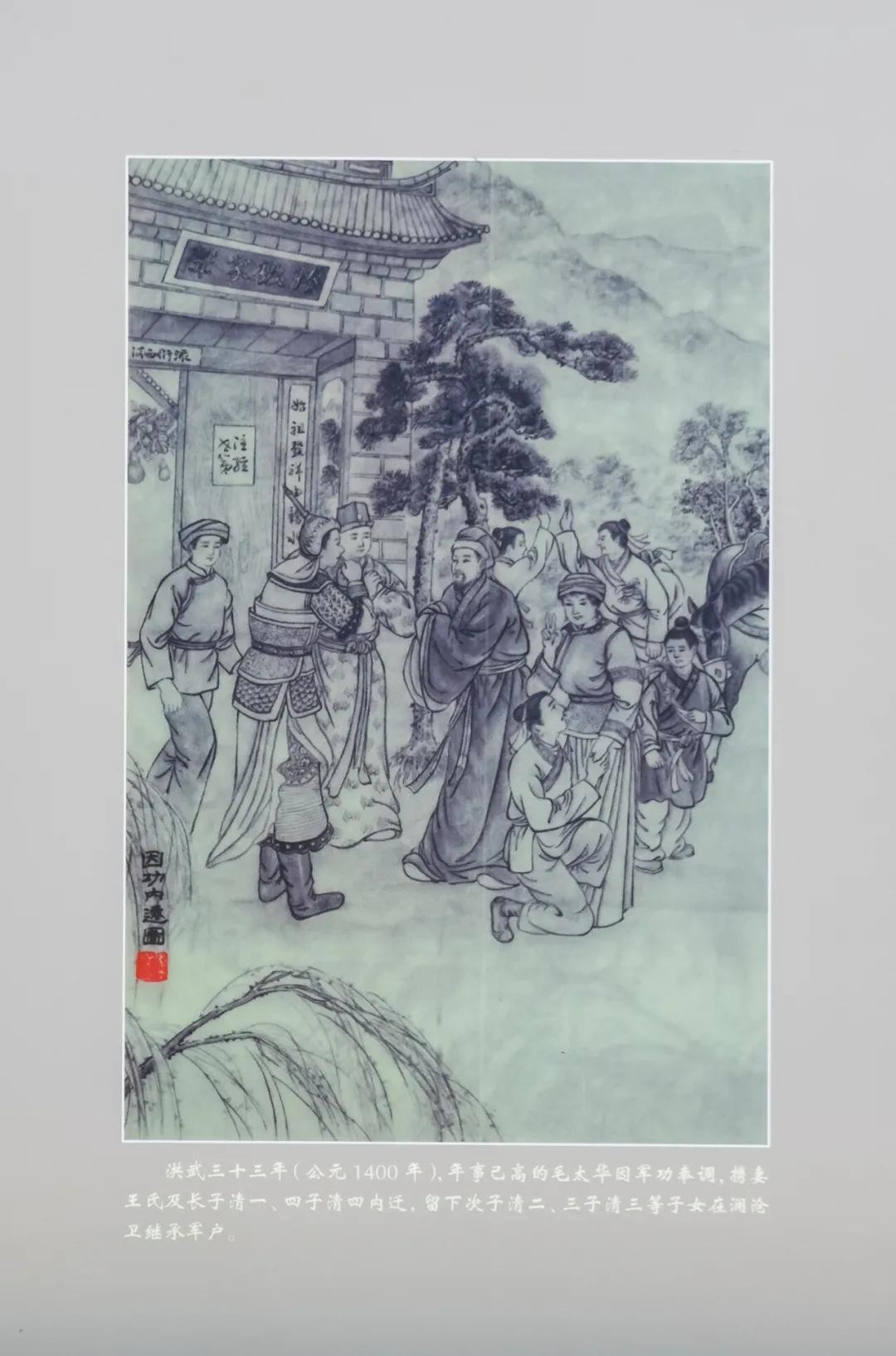 《韶山毛氏族谱·源流记》载:“吾族,派接江西,自宋工部尚书让公世居三衢。生子休公,官至银青光禄大夫、国子监祭酒兼殿中侍御史,出守吉州,迎尚书让公就养,占籍吉之吉水龙城家焉。二十一世传至伯温公,官太子太保、兵部尚书。考据西江宗人,执谱相访,实属西河嫡派。而始祖太华公位下有载:元至正年间,避乱由江西吉州迁云南澜沧卫,娶育子八。明洪武十三年(1380)庚申,携长子清一、四子清四官楚,居湘乡北门外绯紫桥。十余年后,清一、清四复卜居湘潭三十九都,今之七都七甲韶山,开种铁陂等处,编为民籍。”