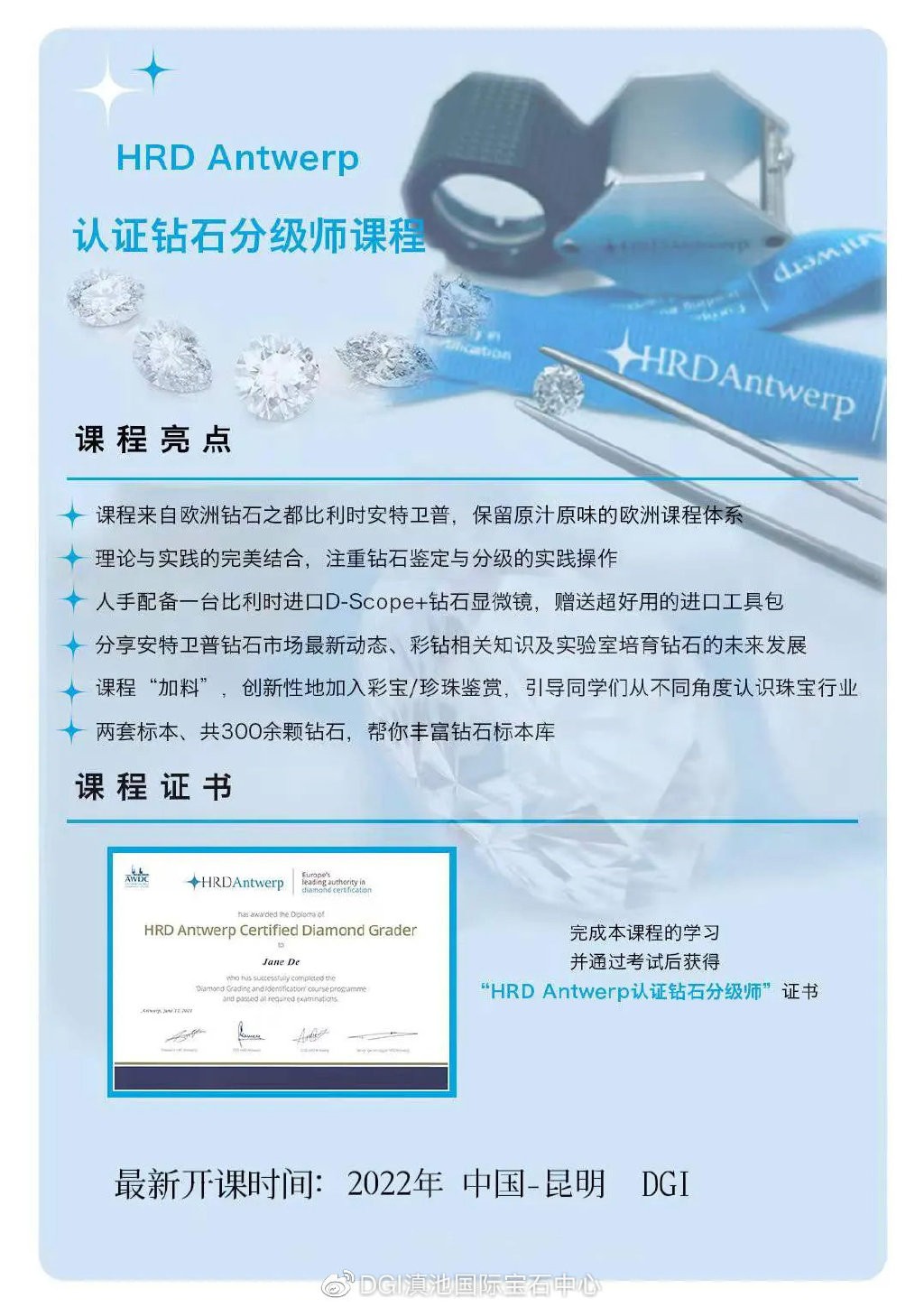 Diamond High Council--HRD(译名比利时钻石高层议会),是世界三大权威综合性珠宝检测、研究、教育机构之一,成立于 1973 年,坐落于世界钻石中心比利时安特卫普,主要 协调比利时钻石业的活动。长久以来,HRD Antwerp 已经成为比利时和国际认可的官方 组织,担当着安特卫普钻石行业组织者、发言人以及媒体的角色。与此同时,HRD 还提 供各种服务,例如出具钻石证书,组织钻石鉴定培训课程,进行科学和技术研究,生产 钻石加工、鉴定设备,以及通过钻石署进行的钻石进口和出口。