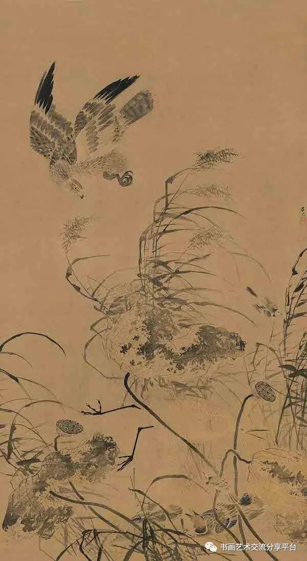《残荷鹰鹭图》描绘了秋日荷塘残叶之中,惊心动魄的瞬间。苍鹰俯冲搏击白鹭,白鹭冲进苇丛深处,希图逃脱,众鸟受惊鸣叫,以至于纷纷躲避,有一只野鸭张嘴向上看,头颈紧缩,呈现恐惧之态。劲风吹动芦苇残荷,更添肃杀之气。