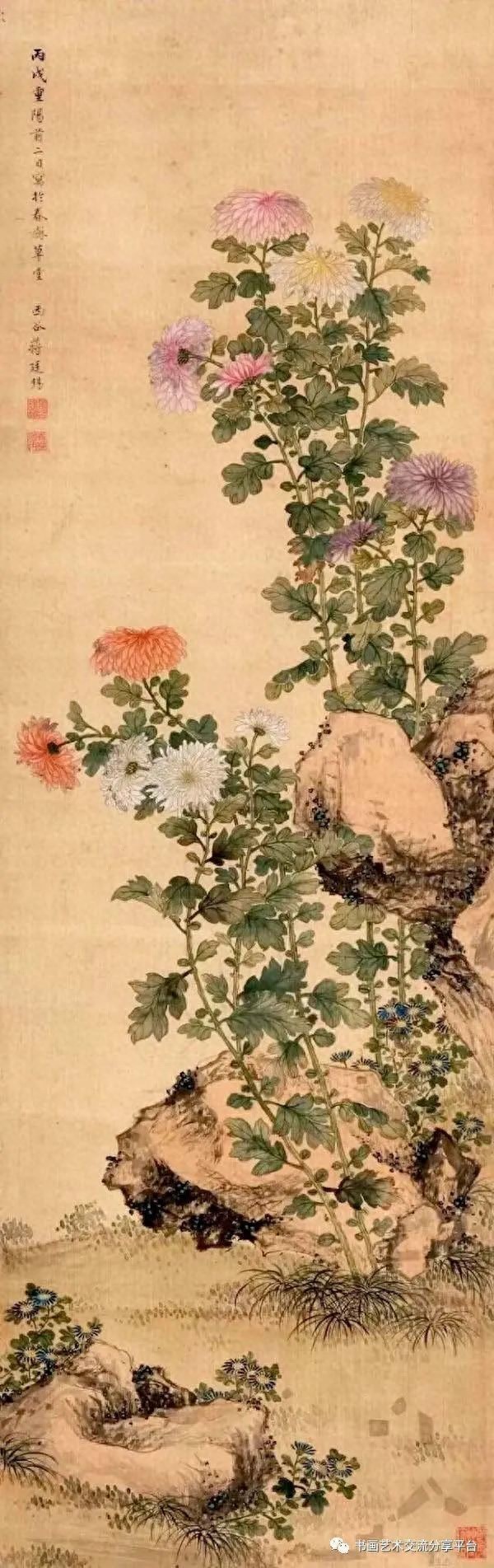 《菊石图》中所绘花卉栩栩如生,不拘泥于工致与否,设色淡雅,乃蒋氏典型风格。蒋廷锡曾提出“写牡丹当于整齐中求生动,若笔太松放便非牡丹品格”,追求宋人的理法和元人的墨韵,即便“仿天池笔,稍就规矩,不能狂毋宁狷也”,仅取其生气,而不取其疏狂。此作可以说得到充分体现。