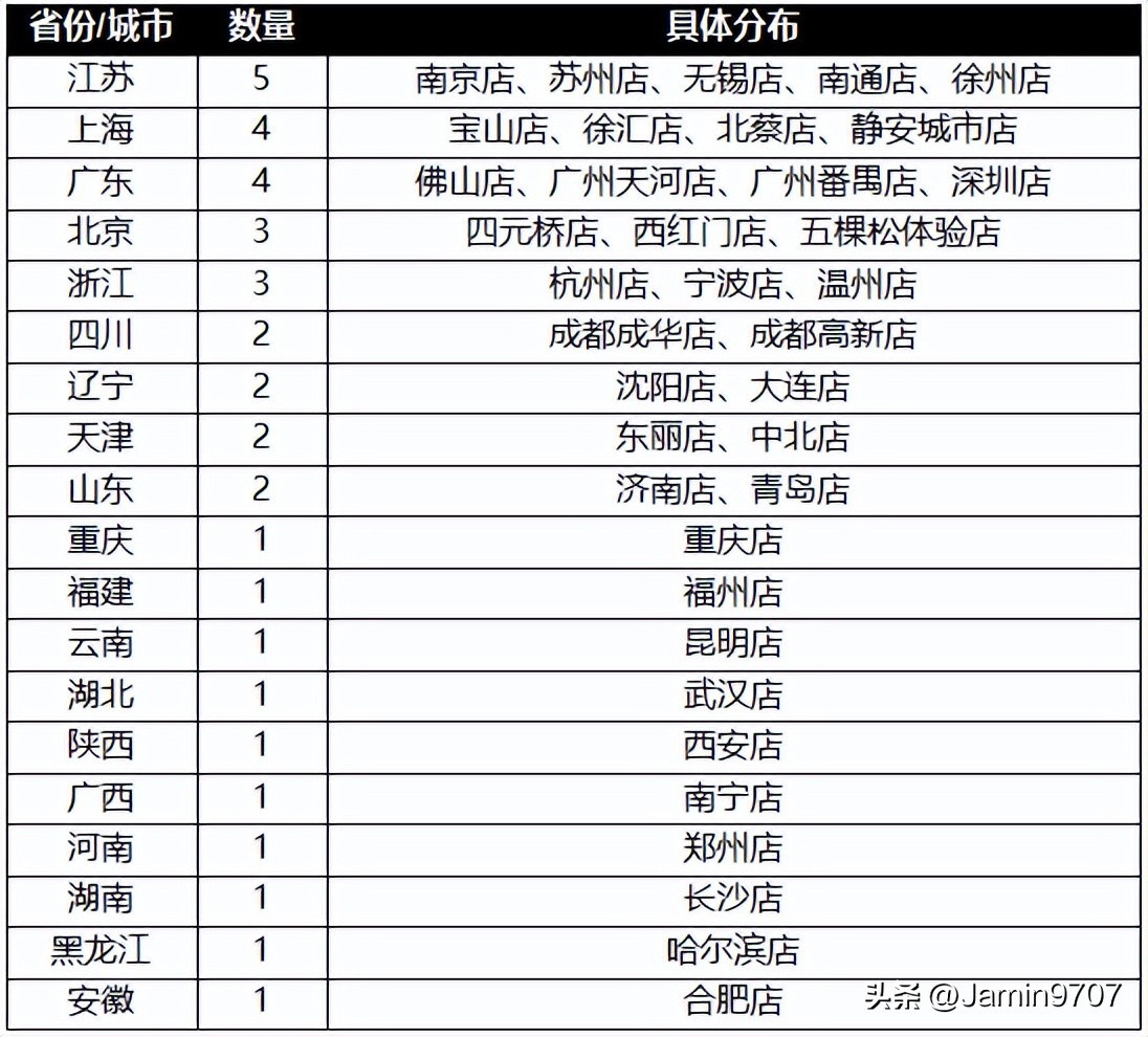 如上图所示,宜家大陆商场主要分布在长三角、广东、环渤海等地区,其中江苏以5家门店居首。上海、广东以4家门店并列第二,北京、浙江以3家门店并列第三。