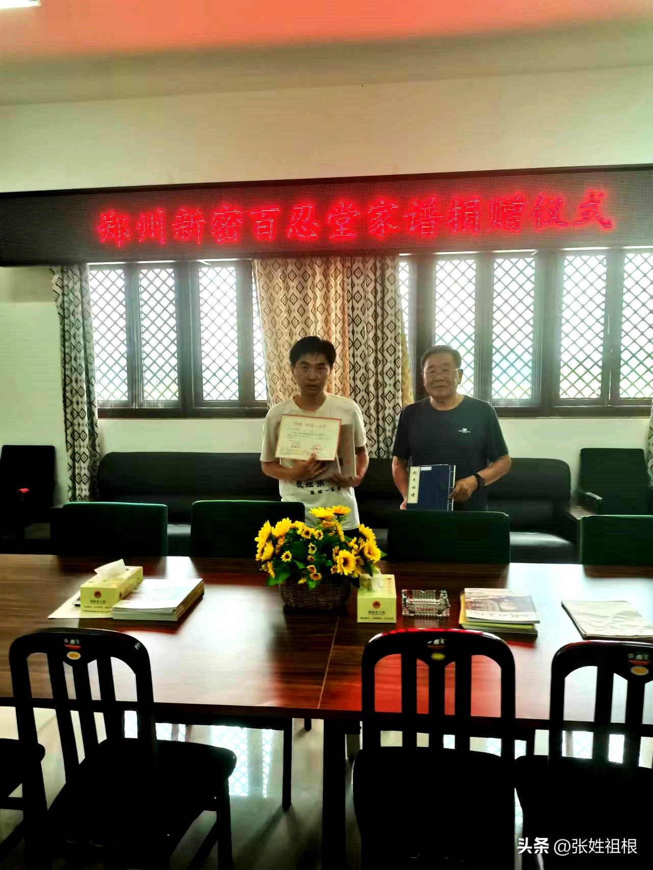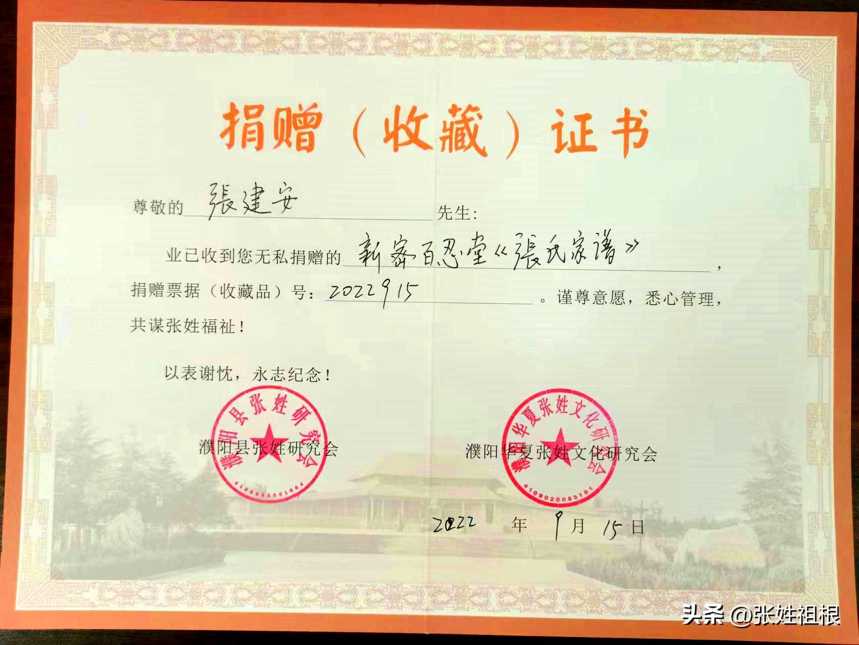 2022年9月15日,河南郑州新密百忍堂《张氏家谱》捐赠仪式在张姓祖根地河南濮阳挥公陵园张姓研究会会议室举行,张姓研究会宣传部副主任张元修受新密百忍堂张建安宗亲的委托捐赠了全套新密百忍堂《张氏家谱》。濮阳张姓研究会永久名誉会长张春喜接受捐赠,并合影留念。办公室主任石海霞、理事张婷婷、张素兰、张楠等参加了捐赠仪式。