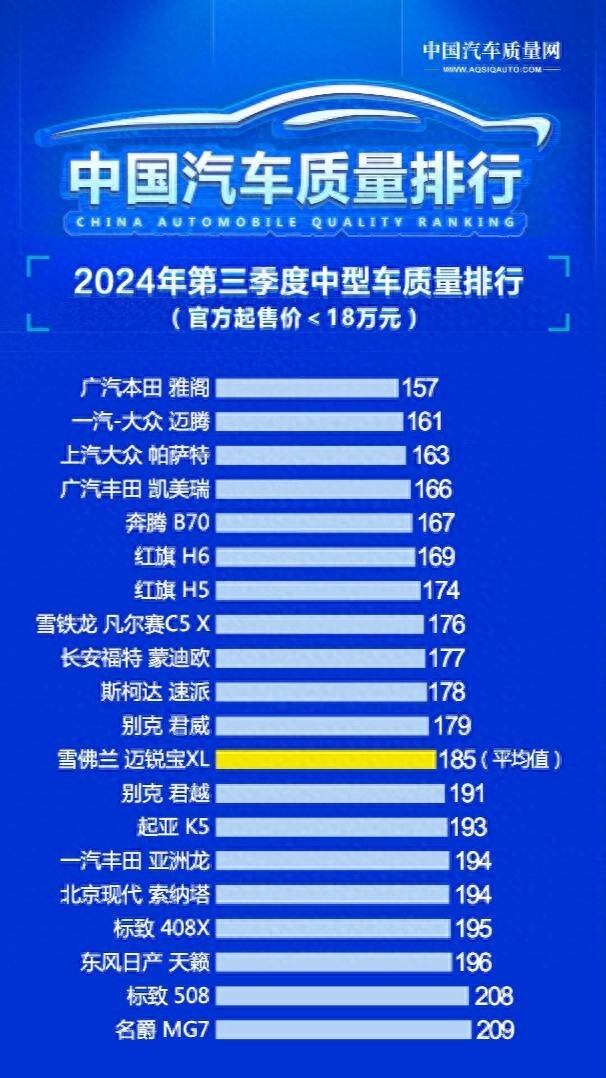 日前,中国汽车质量网发布2024年第三季度中型车质量排行(官方起售价<18万元),此次,共有20款车型参与评选,质量测评的平均分为185分,其中,测评分数小于或等于平分数的车型共有12款,分数越小代表车型的质量越好。