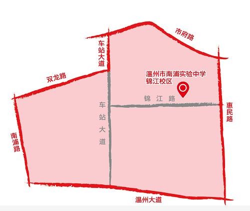 温州市南浦实验中学锦江校区施教区范围为:东至惠民路;南至温州大道;西至南浦路;北至双龙路-车站大道-市府路所形成的封闭区域。