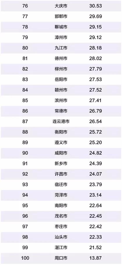 从数量上看,东部地区上榜城市62个,中部地区上榜23个,西部地区上榜15个,百强城市呈现出由东向西阶梯式格局。