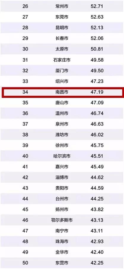 根据榜单,江西有三座城市上榜,南昌排名34,九江排名80,赣州排名84。
