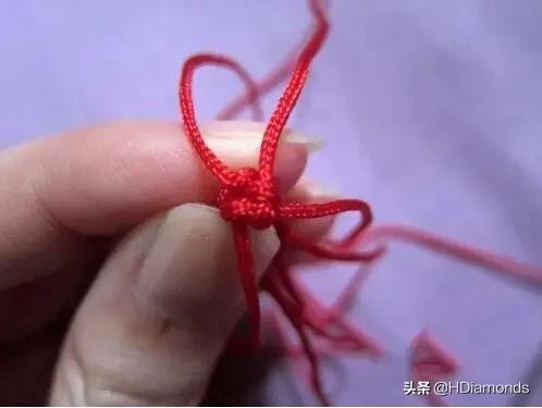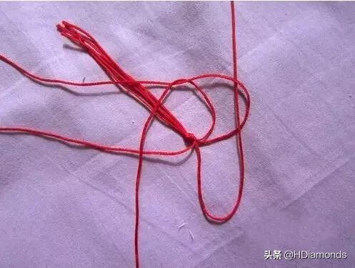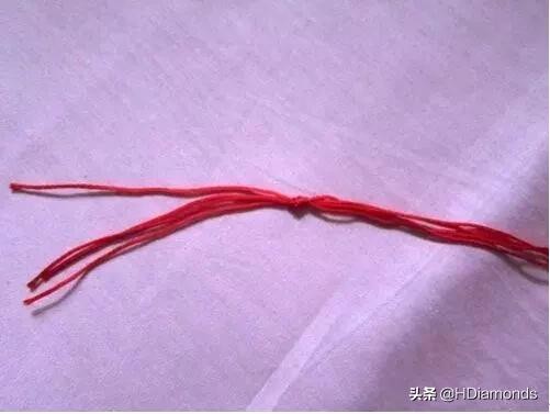 首先我们需要准备好四条红色的绳子,在距离线的一头5-6厘米处打个结。