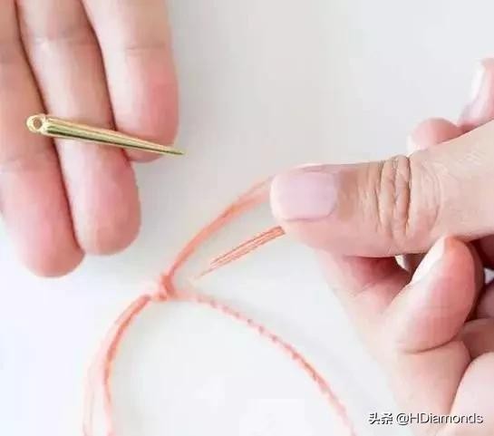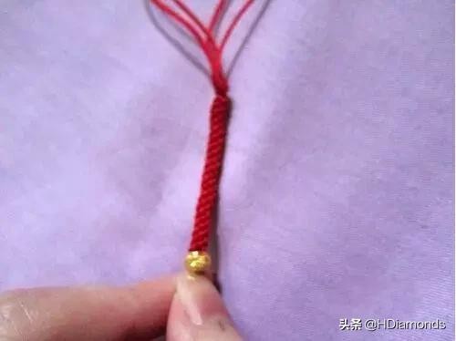 13: 也可以在线头末端处添加颗尖锥吊坠,打完滑结后,将手链的编织放松至可轻松佩戴的状态后,在末端串入吊坠