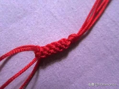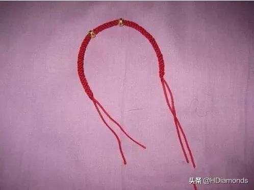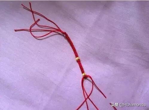 5、换入中间的两根绳子编两次蛇结。以后要一直重复步骤4,在绳子上串入转运珠。