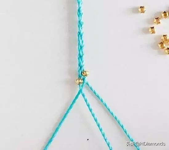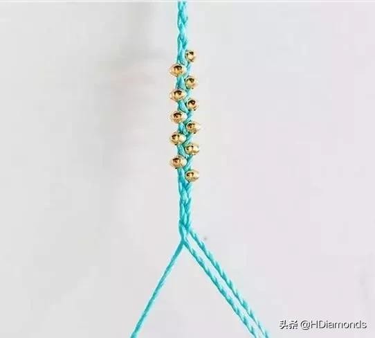 4:将左侧的编线上也串入1颗珠子后,与中间的编线交叉换位,再次将右侧的编线上串入1颗珠子后与中间的编线交叉换位,编织的方法还是与三股辫一样