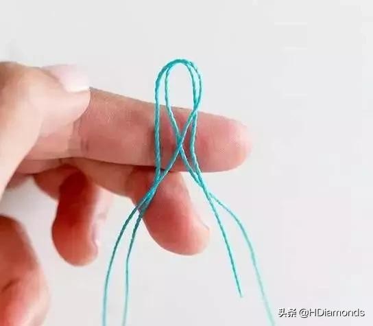 1:将编线对半剪断,再将其中剪下的半根再对半剪断后取其中1根与另半根对折后合并在一起(参考下图所示),在顶部打个活结,其活结的环圈保留0.6cm长,剪去过长的第四股线的末端,留下同等长度的三股线