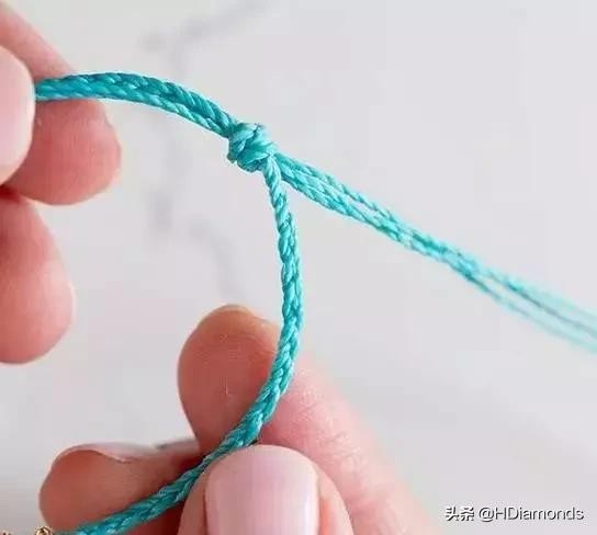 10: 拉住右侧编织线末端,收紧滑结环圈,并测试滑结,收紧和放松手链