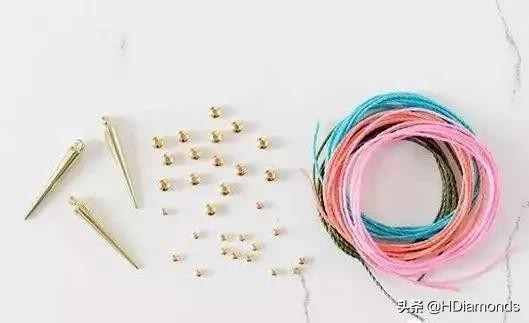 1.3m长72号编织玉线(4种颜色)、转运珠(可按个人喜好选择大小、材质)、3颗尖锥吊坠(可选)、打火机或胶水、剪刀、胶带