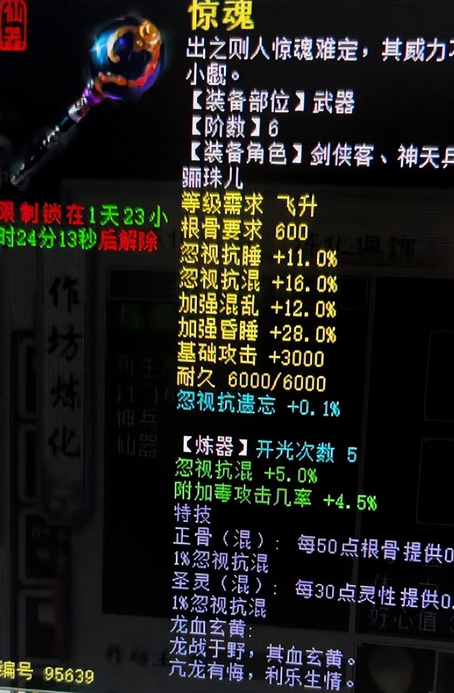 这就是目前看到的现状!双特技忽视混,炼器是极限的忽视混5,这把仙器还不是理论上的全服第一,但是却是现实的全服第一,毕竟蓝字加双特技都要洗出来,那真的和卖1000万彩票没区别了。大君为了洗成现在这个样子用了11.3万把垫底!各位玩家可以根据自己服务器的物价,算算这位大佬的洗练成本!