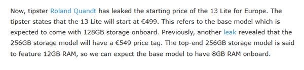 2月17日,手机中国注意到,有海外数码媒体援引相关消息人士的信息表示,小米13 Lite这款机型在欧洲市场上将会提供128GB和256GB两种配置,至于运行内存的配置我们暂时还不清楚,高配版本可能会配备12GB的运行内存。其中,128GB存储版本的售价为499欧元,大约相当于3650元人民币,256GB存储版本的售价为549欧元,大约相当于4000元人民币。值得注意的是,海外市场上的小米13 Lite应该就是国内市场上的小米Civi2改名,但是前者价格却远超后者。