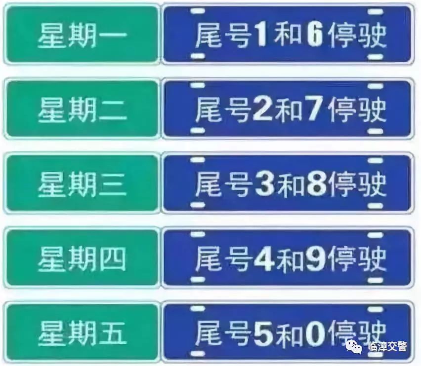 限行尾号:周一:1和6;周二:2和7;周三:3和8;周四:4和9;周五:5和0;含临时号牌,尾号为英文字母的以倒数第一位阿拉伯数字为准。