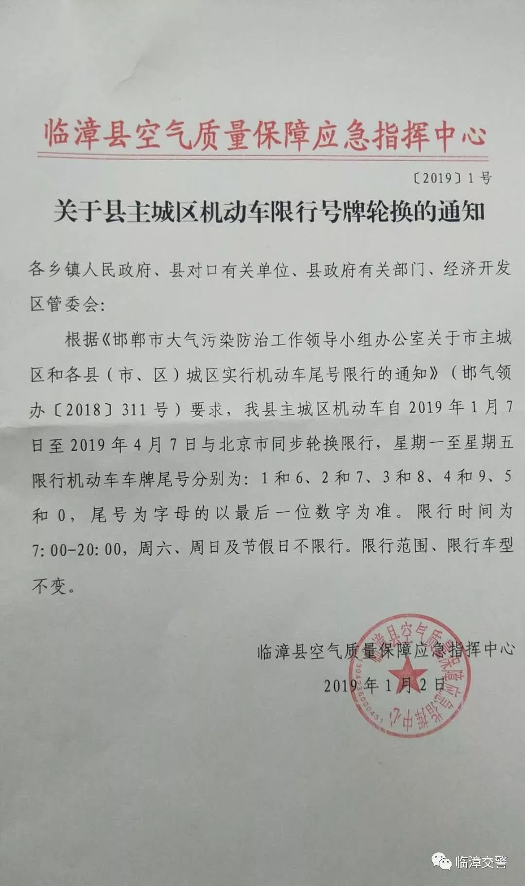 接临漳县空气质量保障应急指挥中心通知;2019年1月7日起临漳县主城区继续实施常态化限号措施,并与北京市保持同步轮换。工作日7:00—20:00,对机动车实施限行两个尾号;周六、周日及法定节假日不限号。