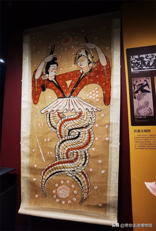 《伏羲女娲图绢画》是吐鲁番阿斯塔那墓出土。现在存于新疆博物馆。绢质,以白、红、黄、黑四色描绘,人首蛇身,伏羲左手执矩,女娲右手持规。二人上体相拥,下体相缠,是中国传说中的始祖神。