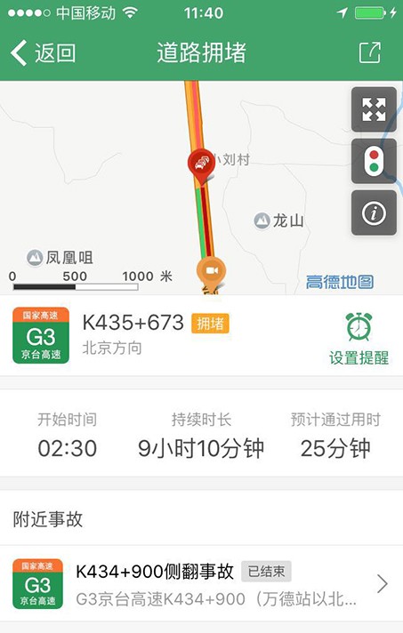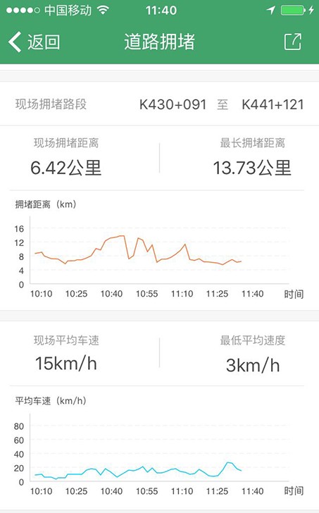 另外,京台高速山东段,万德站附近,因道路施工占用超速车道、限速等因素,经常性的堵车严重。今日11:40“e高速”APP实时路况截图如下,截止至11:40,京台高速已堵车9个多小时: