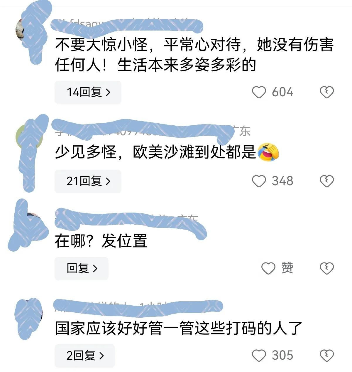 网友认为不用大惊小怪,要平常心对待,她没有伤害任何人,生活本来就多姿多彩。欧美沙滩到处都是。