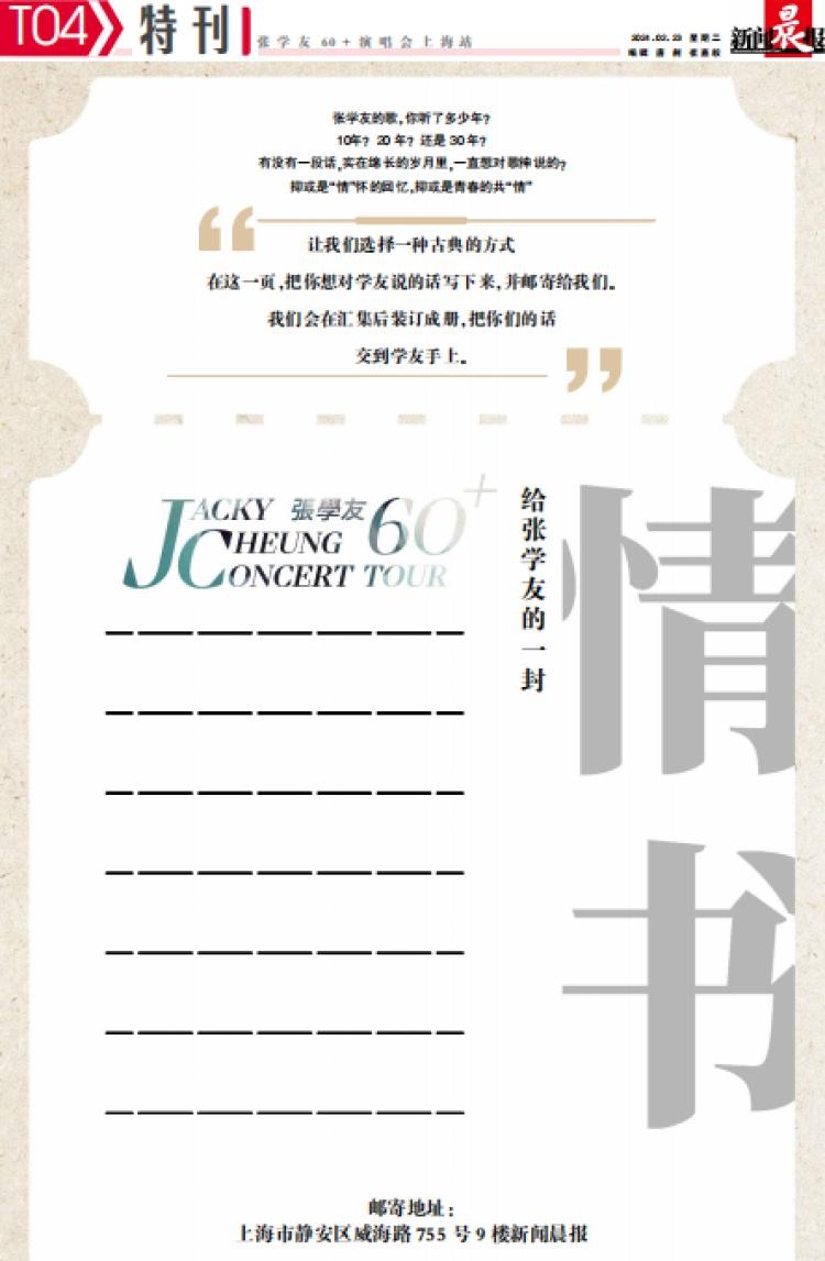 参与线上征集活动,你的故事和心声将有机会出现在新闻晨报周到相关媒体报道中,更有机会获得《新闻晨报·张学友60+巡回演唱会特刊》的全铜版纸豪华限定版!有了这份纸质的特刊,你的留言就有机会被呈送到歌神手中!