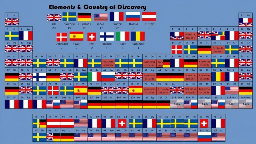 首先我们来看一张图,如果我们将化学元素周期表每个元素是哪个国家发现的就用这个国家的国旗代替,那么我们将看到如下这张图: