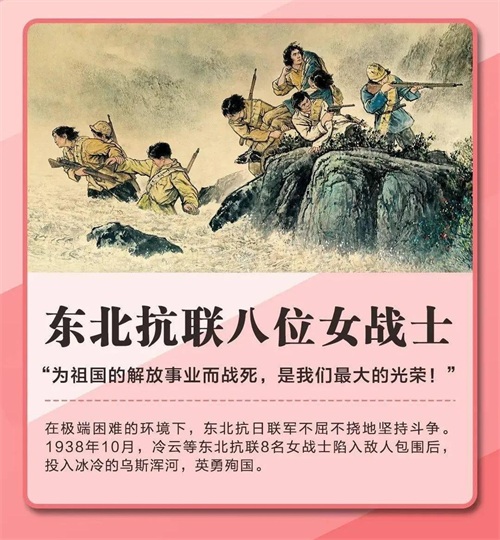 李敏介绍说,抗联中曾有过一支著名的女团,女战士们英勇作战,建立了不朽的功勋。它于1937年冬成立,经过半年多的艰苦厮杀,全团就只剩下冷云等8人。1938年10月上旬,抗联第5团西征部队100多人在乌斯浑河畔同日伪军遭遇,冷云等妇女团的最后8位女战士承担了掩护全队撤离的任务,被敌人凶猛的火力压到了河岸边。她们宁死不当俘虏,背起重伤的战友,跳入激流滚滚的乌斯浑河壮烈殉国。这就是著名的"八女投江"的故事。
