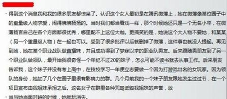 得到这个消息我和我的很多朋友都惊呆了。认识这个女人最初是在腾讯微博上,她在微博里向某位圈子中的重量级人物求爱,闹得沸沸扬扬的。当时我们都当看戏一样,那个时候她还只是一个无名小卒,在微博扬言自己在各个方面都很优秀,哪里配不上这位大咖。更搞笑的是,她说这个大人物不要她,和某某(另一个重量级人物)在一起也可以。