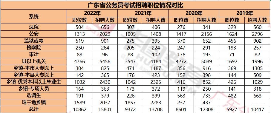 通过以上表格,我们可以看得出广东省公务员考试职位表每年的招录人数都比前一年多,就比如2022年招录人数15801人,相对于2021年招录的13708人,增幅为15.27%。2023年广东省公务员招录的人数也可能会更多。