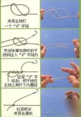 第四步:将主线穿过第四个漂,打一个结,然后将此处剪去并粘结防止缠绕胶水。