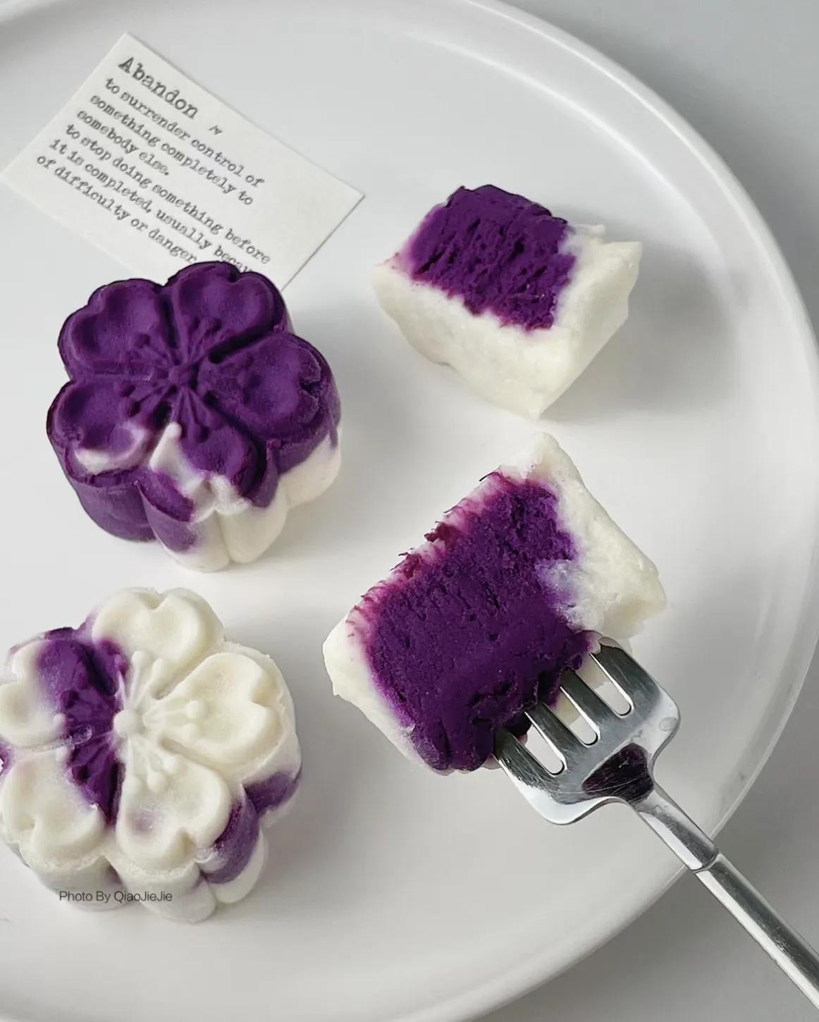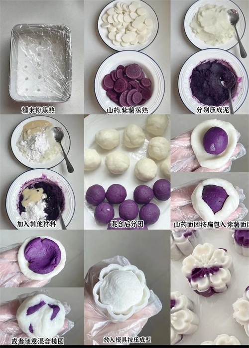 紫薯+山药蒸熟混合成泥,模具压成型后撒椰蓉,软糯香甜超治愈!