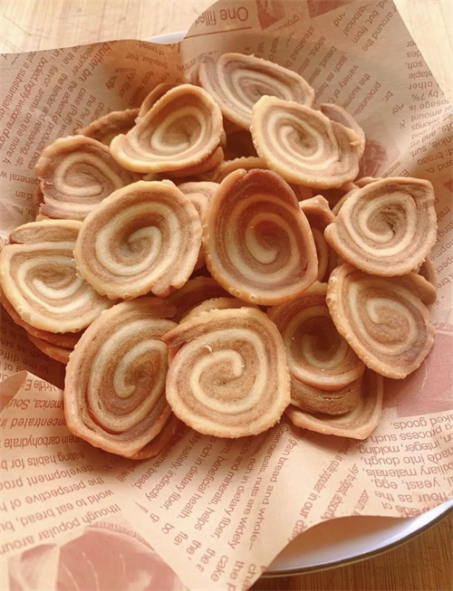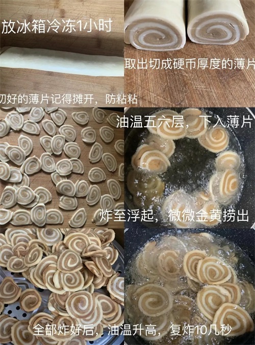 用面粉+糖/红糖揉面,卷成“瑞士卷”冷冻切片油炸,甜咸双拼超酥脆!