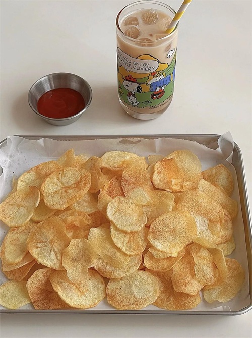 土豆切薄片泡水去淀粉,160℃烤10分钟;黄瓜切条撒盐腌10分钟,风干后超爽脆!