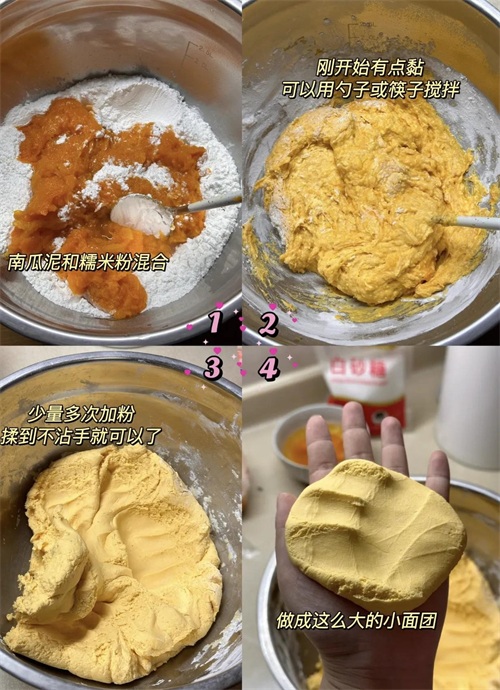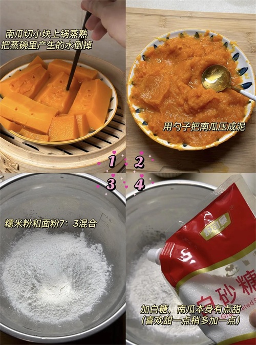 南瓜蒸熟压泥+糯米粉揉团,蒸15分钟出锅,软糯香甜不粘牙!