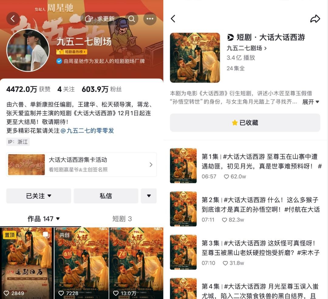 近日,随着《大话大话西游》第24集更新,这部抖音精品短剧走向大结局。自11月8日开播以来,这部剧一直位列抖音短剧热度榜榜首,截至目前,该剧在抖音收获播放量超3.4亿,剧播期间抖音账号“九五二七剧场”涨粉超125万。
