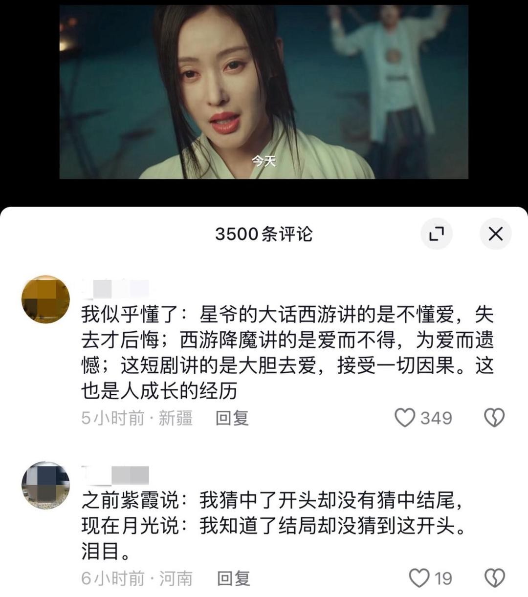 “欠星爷的泪水悄悄划过20多年,没想到在短剧滴落。”大结局集的评论区里,有网友评论表示《大话西游》讲的是不懂爱,失去才后悔,短剧版讲的是大胆去爱,接受一切因果,这也是人成长的经历。男女主的感情线是该剧的故事主线,另一条至尊玉假扮孙悟空的成长线,也是主创团队想重点讲述的,“孙悟空是我们童年认识的第一个大英雄,但在生活中,我们都是小人物,没有人生来是孙悟空,但我们都有可能会成为孙悟空。”