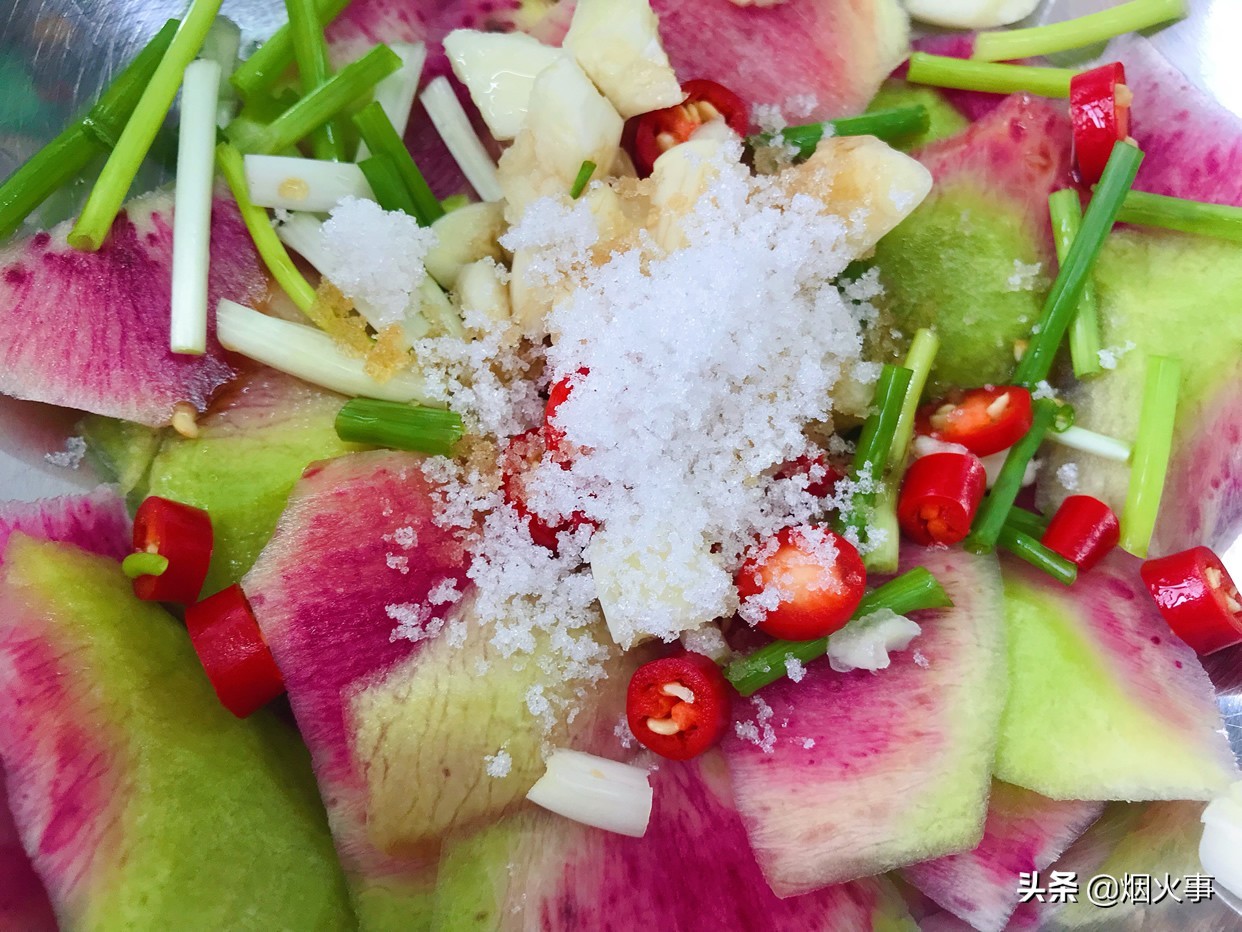 3、市面上的辣椒酱主要有油炸辣椒酱、剁辣椒酱和发酵辣椒酱。其中油炸辣椒酱的脂肪含量最高,盐的含量也很高,所以用老干妈拌凉菜的时候,就不要再炸花椒油了。除了腌萝卜皮时候放的盐,也不要再额外放盐了。