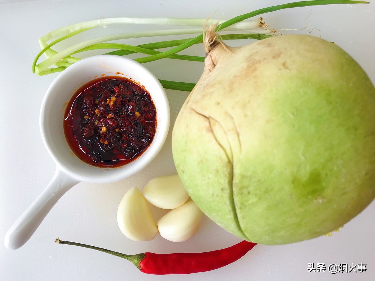 1、首先我们要准备好制作【老干妈拌萝卜皮】这道凉菜所需要用到的食材,选用较大个心里美萝卜一个,香葱两根、大蒜3瓣、小米辣1个、老干妈酱一勺。