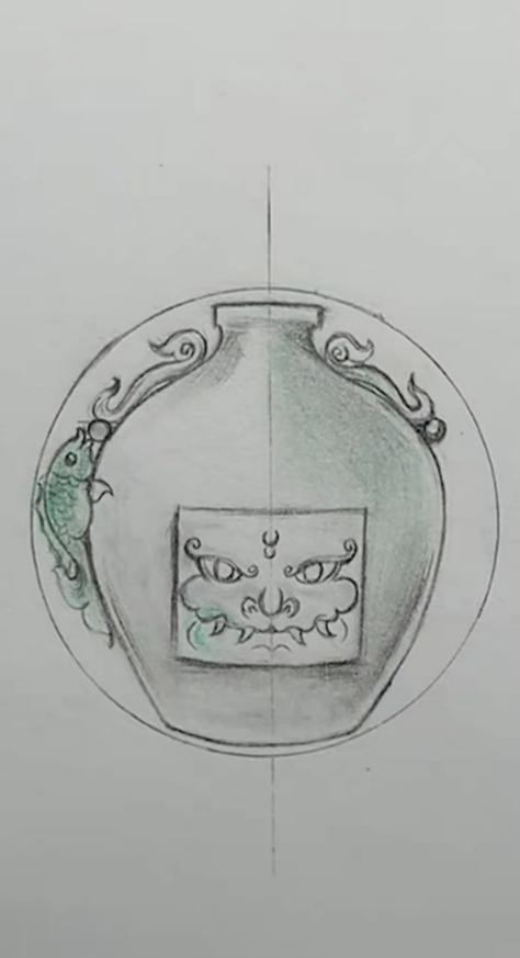 这件镯心的厚度显而易见很厚实,比较利于后续掏空,边上的花色可以俏色做成立体镂空雕,让整体不会过于素净。正面中间浅雕饕餮仿古纹,增加几分古典韵味,背面则不做任何设计,保留原有的风味,毕竟鼻烟壶的体量比较小,设计做得太满的话只会显得繁杂。