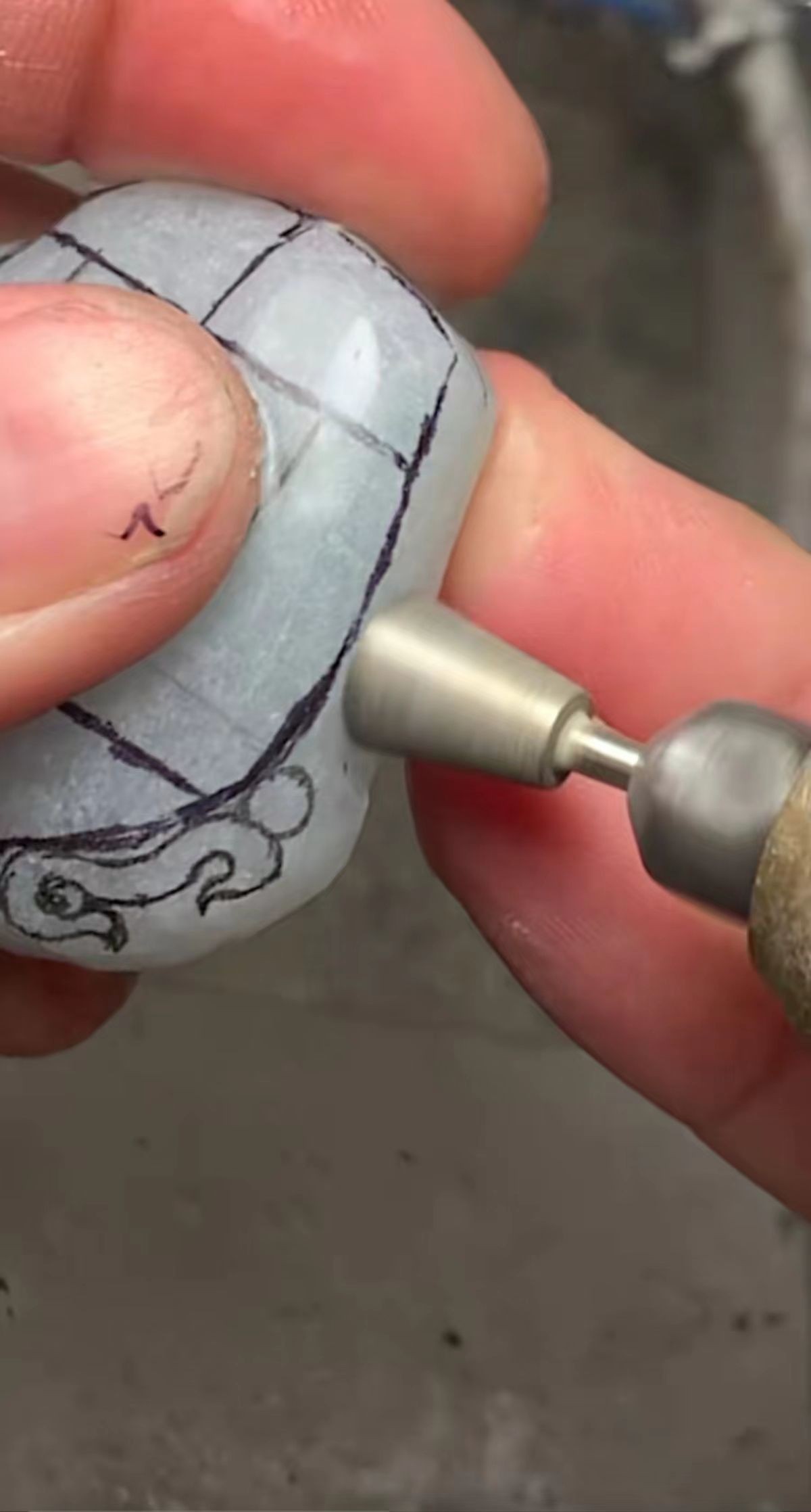 这是最具危险性的一步,直接影响鼻烟壶最终的成品质量。首先得找准中心定位轴,再用直径0.3至0.4cm的长棒由壶口慢慢打孔深入,接着用弯曲的细铁棒在内部旋转掏空,期间稍有偏差便可能“破膛”,导致前功尽弃,非常考验玉雕师的功力。