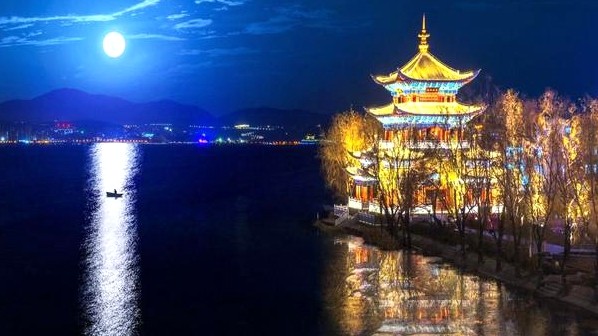 **洱海月**:洱海形状似耳,从空中俯瞰,宛如一轮新月,宁静地依偎在苍山和大理坝子之间。洱海月色,水光相接,令人心醉神迷。在洱海最南端的团山,有一座洱海公园,乃是观赏苍山洱海美景的绝佳之地。