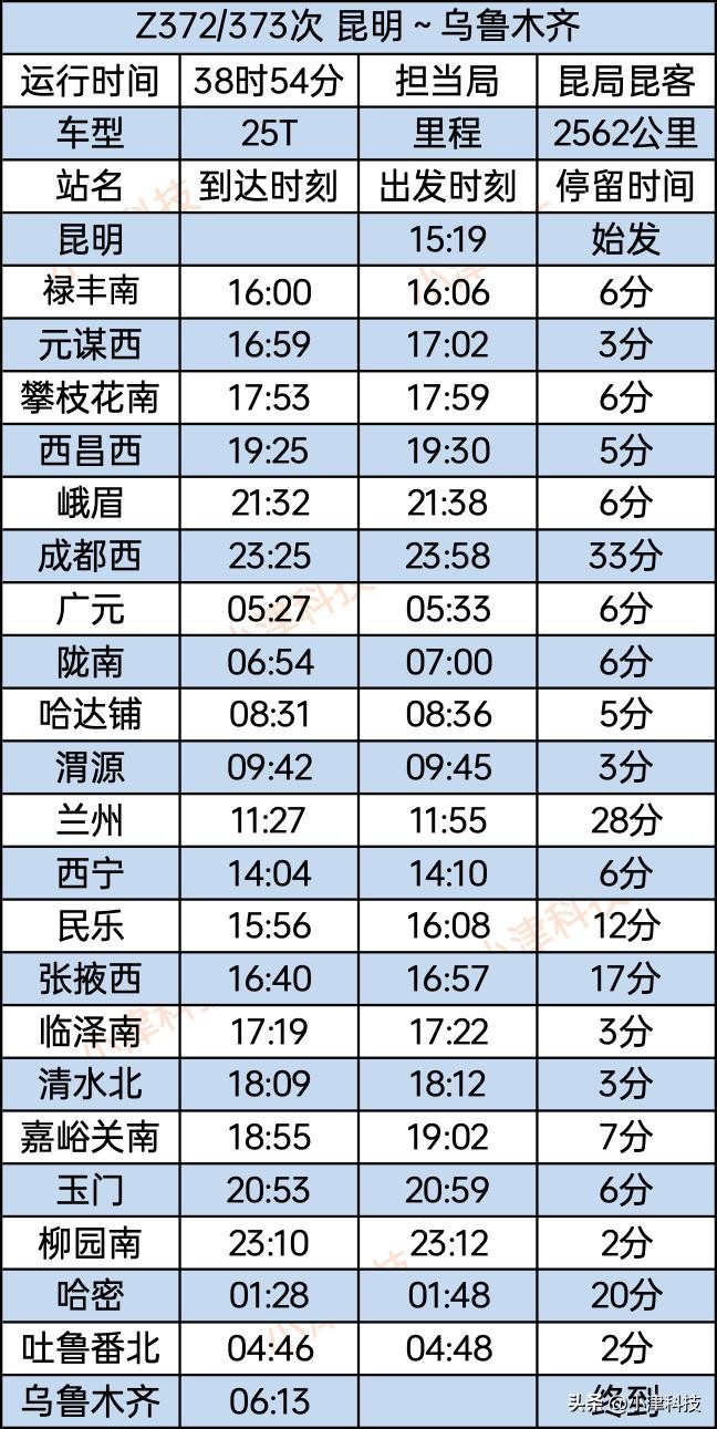 昆明站至乌鲁木齐站Z372/373次运行38小时54分,经停昆明、禄丰南、元谋西、攀枝花南、西昌西、峨眉、成都西、广元、陇南、哈达铺、渭源、兰州、西宁、民乐、张掖西、临泽南、清水北、嘉峪关南、玉门、柳园南、哈密、吐鲁番北、乌鲁木齐。