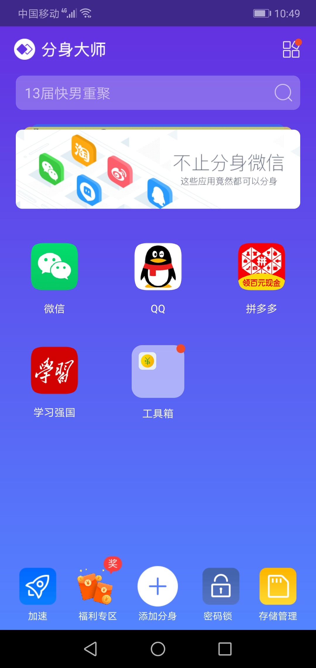 手机分身是手机上运行的可以实现软件和游戏双开,甚至多开的软件,使用者可以打开手机分身软件,即可多个软件的同时运行,不用下载多个软件,实现聊天,工作,娱乐等等一系列功能。