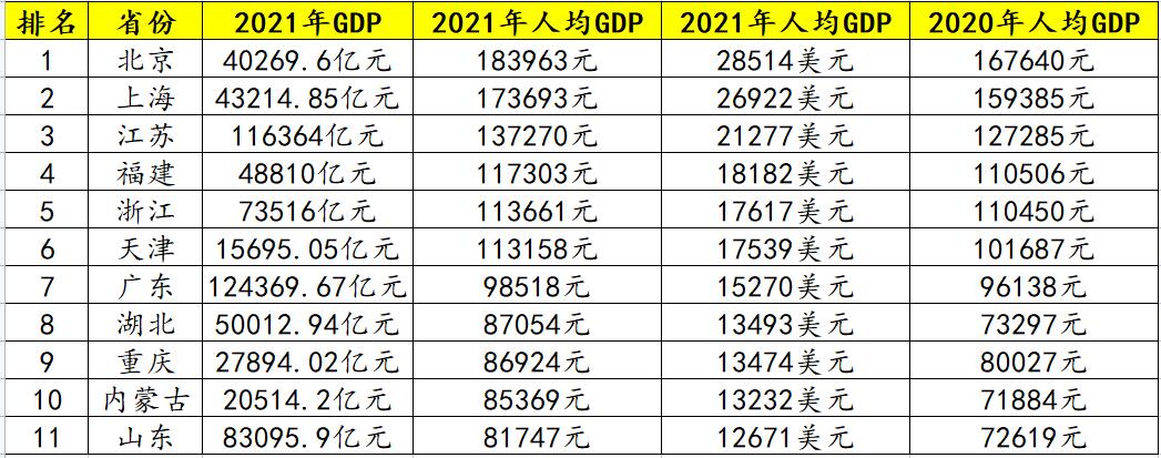 那全国各省的人均GDP又是多少呢?目前还有几个省份GDP数据还没出来,我们先看看人均GDP前十强。