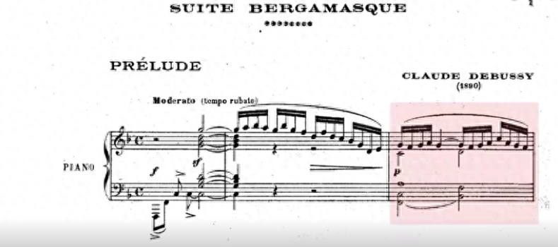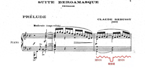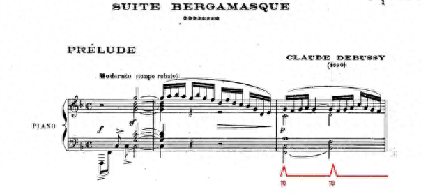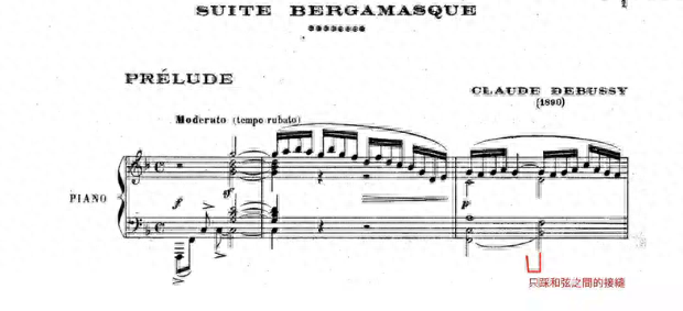 比如在德彪西《贝加马斯克组曲》前奏曲开头第三小节的这个部分,一些没有经验的人看到下面的两个和弦,就想着换两次踏板,但是这样做就会让高音听起来不那么干净、纯粹。